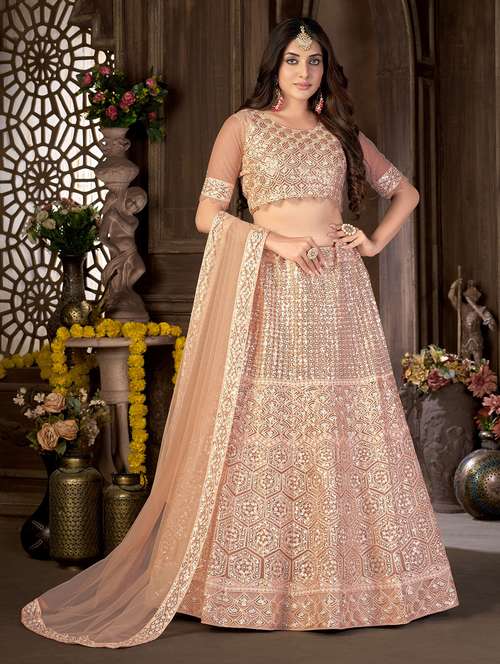Varni Fabrics Women Net Embroidered Peach Color Lehanga Choli Set