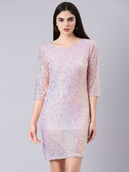 SHOWOFF Women's Crew Neck Three-Quarter Sleeves Bodycon Embellished Peach Above Knee Dress