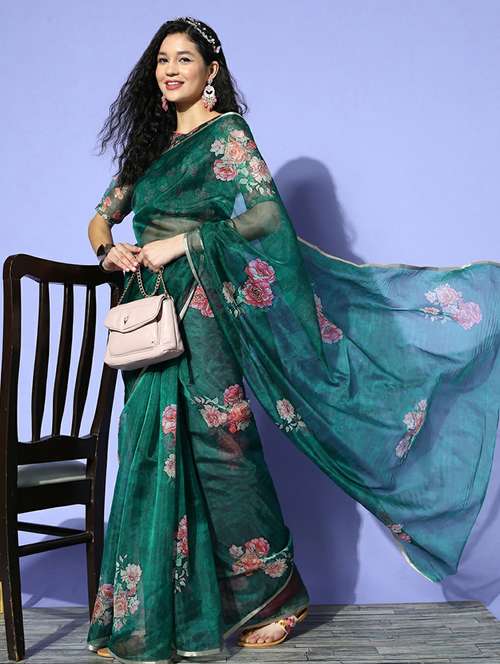 Riva Enterprise Women's Organza Flower Printed Golden border Saree