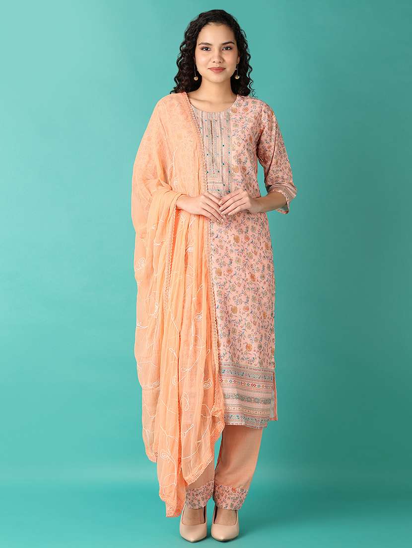 - Find gorgeous sets of ethnic wears in trending designs in peach colors suitable for casual wear of occasions.