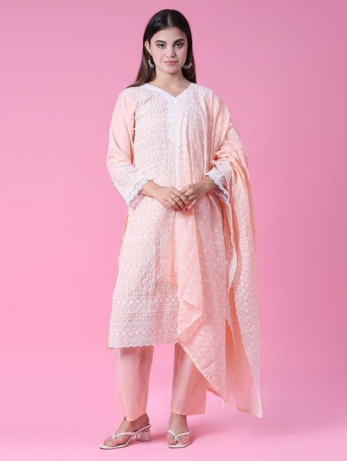- Find gorgeous sets of ethnic wears in trending designs in peach colors suitable for casual wear of occasions.