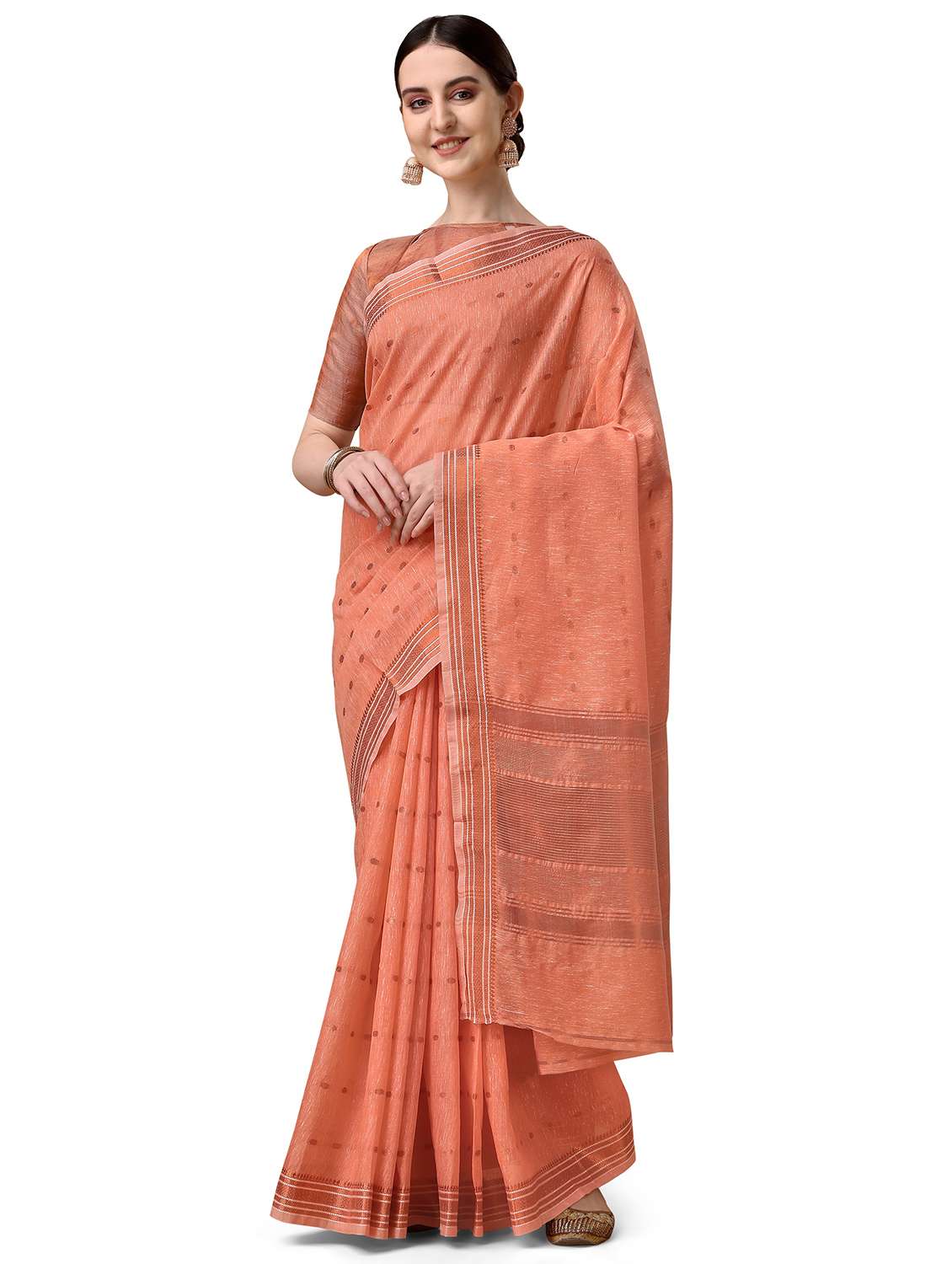 An Exclusive Silena Hand & Loom Product from the House of Art Decor Fashions marketed exclusively online by Studio Venus. A maintenance-free product comprising Kasab Zari Weaves, featuring good color-fastness. Feel free to handwash. Saree Fabric: High-quality Polyester-based Faux Silk // Blouse Fabric: Faux Silk Alternate Fabric/Work-type Names: Banarasi Art Silk // Jacquard Woven Kanjivaram Style Sari // Zari Woven Length: Saree: 5.30 meters // Blouse-piece: 0.70 meters Colour: Saree Color: Peach // Blouse Color: Multi Color. Work: Woven Saree // Blouse-piece: Attached Woven Blouse-piece Occasion: Formal Wear // Evening Wear // Traditional Wedding // . Included Contents: Saree with Attached, Unstitched Blouse Piece Product Colour may slightly differ from the one that appears in the images or videos presented due to the limitation of photographic/display technologies. The blouse worn by the model, ornaments, purses or any other accessories in the image are for style-representation only. The blouse-piece image has been separately provided for the assessment.