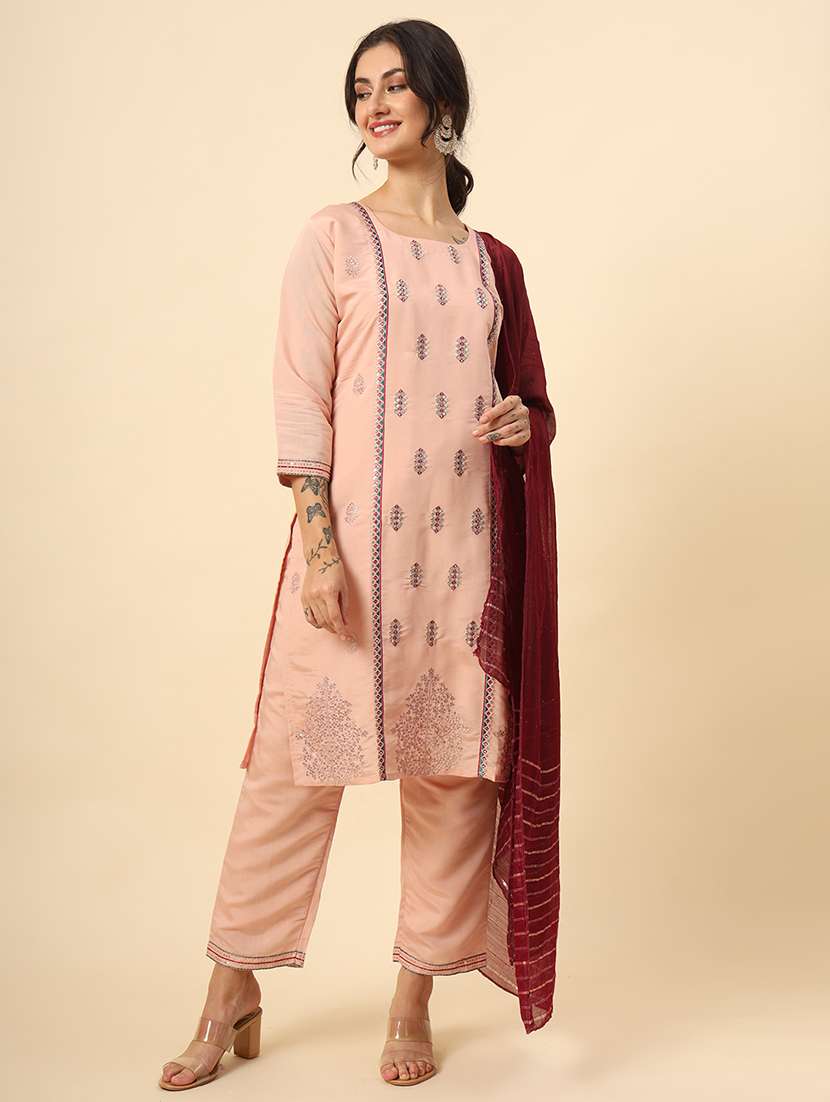 - Find gorgeous sets of ethnic wears in trending designs in peach colors suitable for festive wear of occasions.