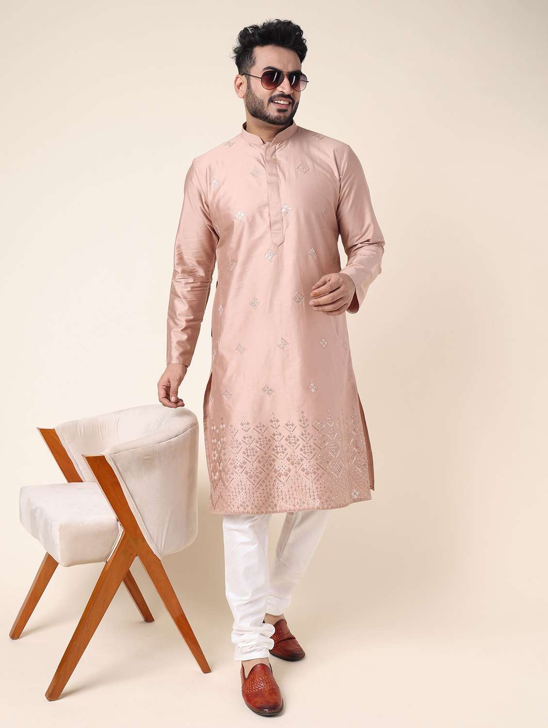 men solid with work long sleeve kurta churidar ethnic wear set