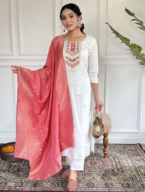 • Find gorgeous sets of ethnic wears in trending designs in white colors suitable for festive wear of occasions.