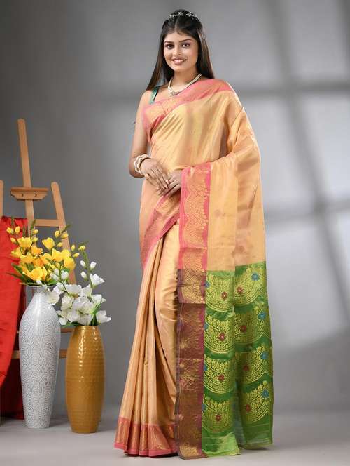 Drape a shimmer piece of class and elegance with this peach tissue silk saree. It has texture motifs all over with simplicity. This saree has intricately woven texture pattern contrasted borders with zari. The contrasted pallu is highlighted with zari woven texture patterns for a loving look.