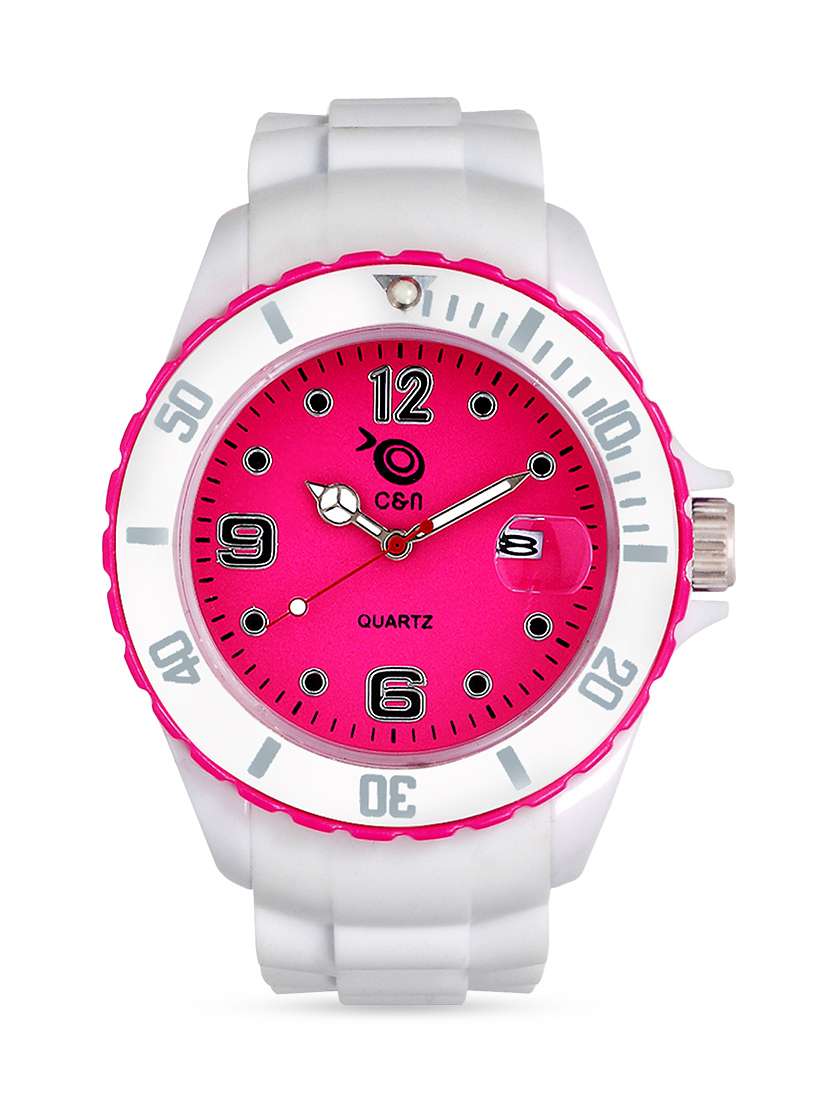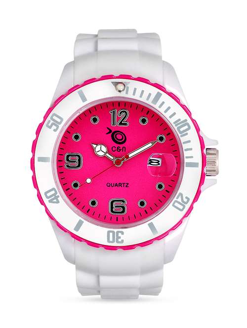 - » pink and white analog round dial watch