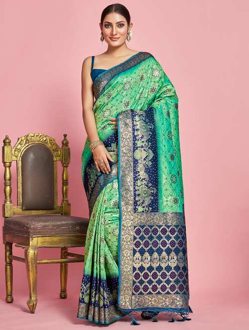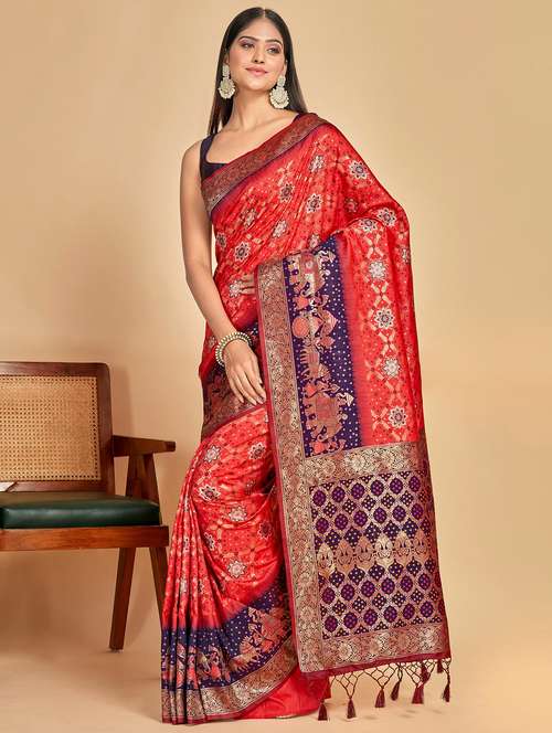 Strawberry color Traditional Saree, With Woven Zari work with meena motif all over, Has Zari woven border and pallu and Tussel Work at the end , Comes With Navy Blue Color Contrast Unstiched Blouse (Included In sarees Length 5.40 Mtr .80 Cm)