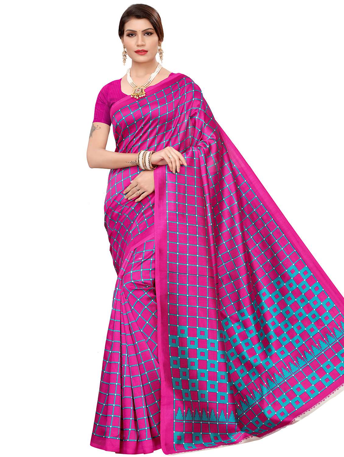 Printed art silk sari with checks and temple print. Printed blouse; Material Measurements: 5.5 m long & 112 cm wide saree. Blouse length - 80 cm; This casual wear saree is stiff, comfortable and lends a formal look; Ideal if you are looking for sarees for women party wear, printed sarees, fancy sarees, plain sarees, latest sarees, daily wear sarees, cotton sarees, bhagalpuri sarees, bhagalpuri cotton silk sarees, art silk sarees, soft sarees; Care Instructions: Hand Wash or Mild Machine Wash is recommended. Colours do not bleed