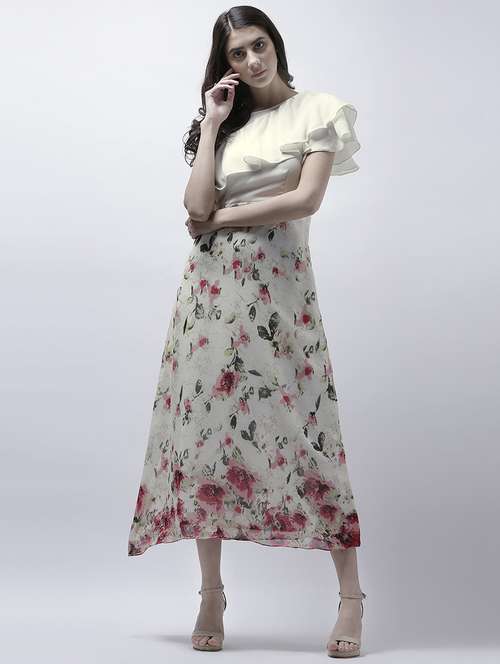 Athena off-white floral printed ruffled dress with pink solid bodice and lining, has round neck and assymetrical frills. Tailored in regular fit and a concealed zip closure on the left side .Made from premium quality of georgette.