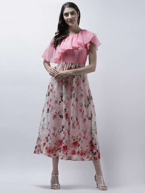 - » pink floral single cold shoulder ruffle dress