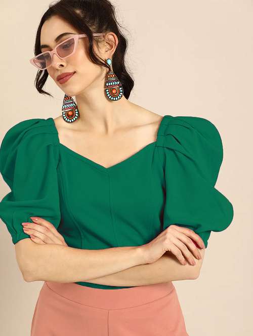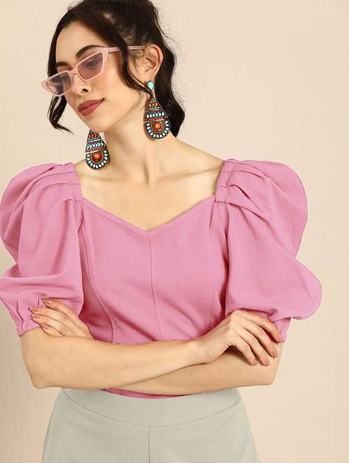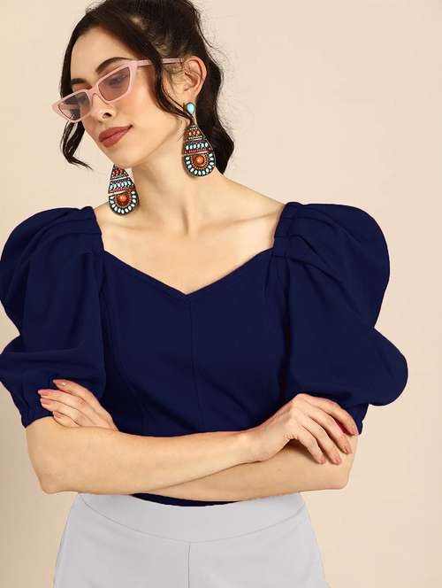 - Opt for this top made up of crepe material and get it in a varied neck design.