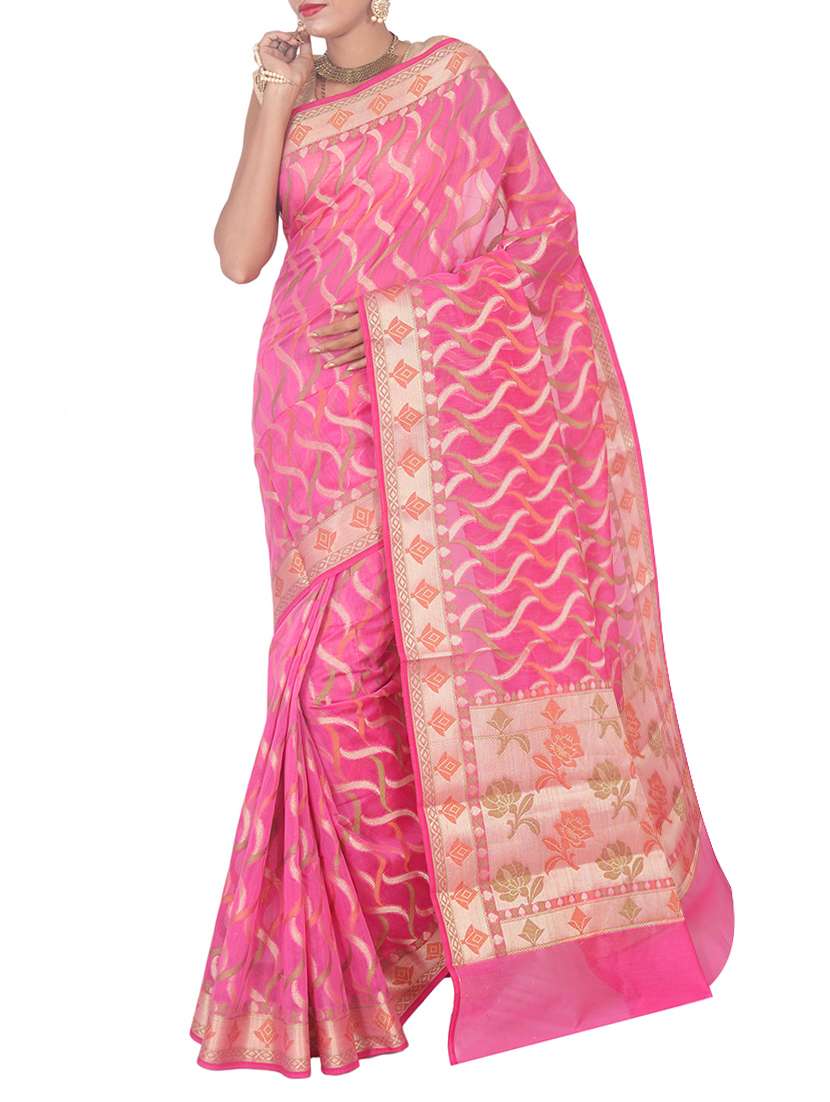 Asavari, in its \"Chanderi Meenakaari\" collection, presents cotton & art silk blend banarai saree with beautiful Meenaakaari work in the entire spread of the saree. P.S:-Model's blouse is for representation only. Please see blouse CAD image for actual Blouse-Piece.