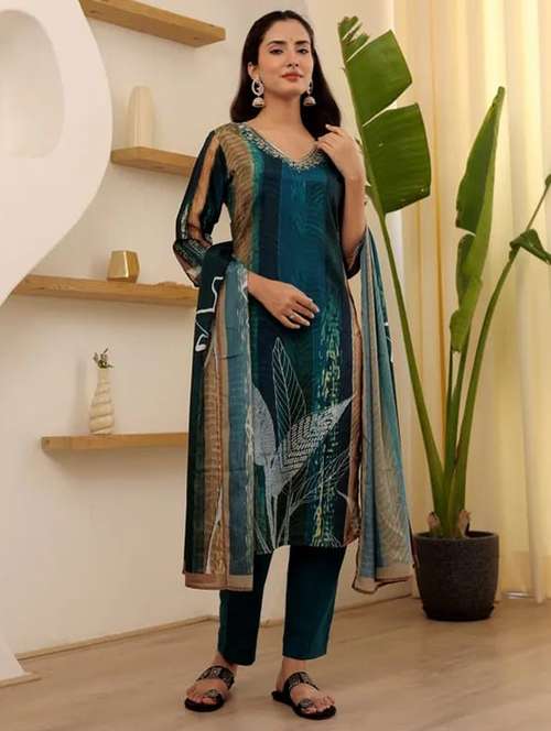 - Browse through the latest range of ethnic sets for women with tailored sleeve designs with embroidered works.