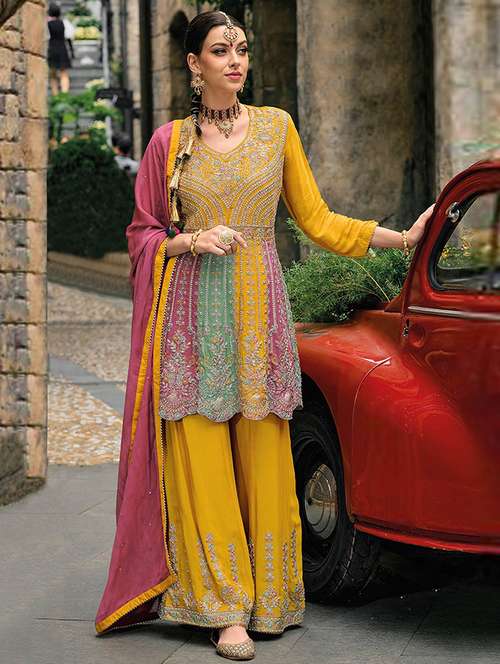 - Find versatile complete set of semi-stitched suits in trending designs in multi colors suitable for festive wear occasions.