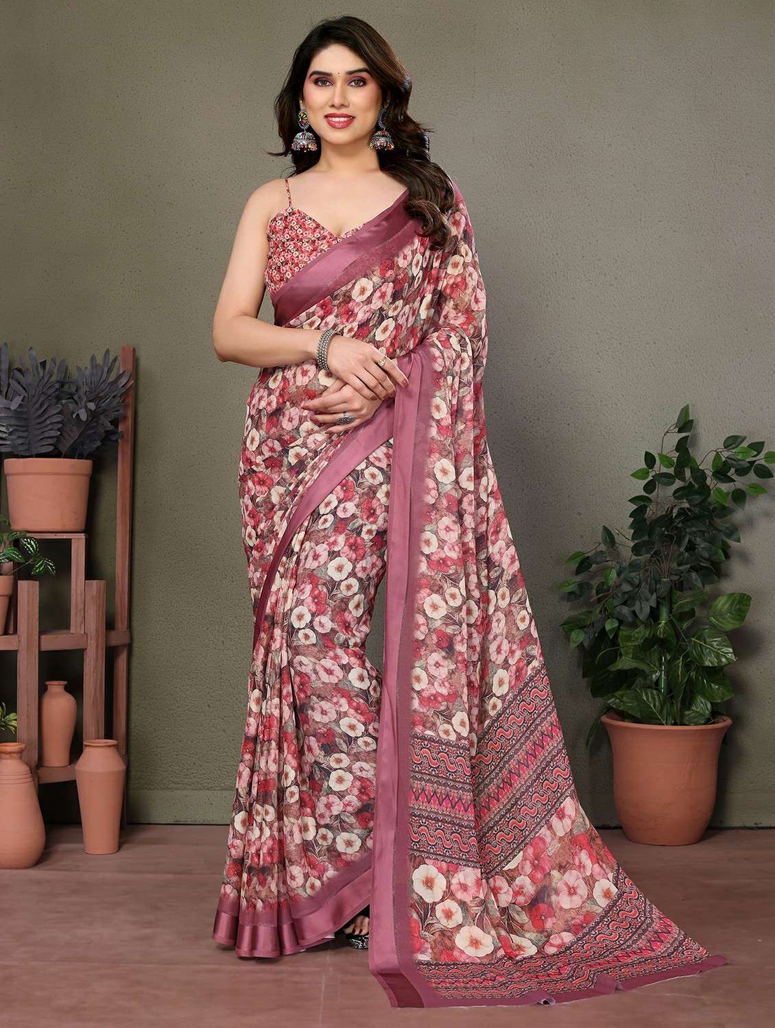 - » women pink floral printed saree with blouse