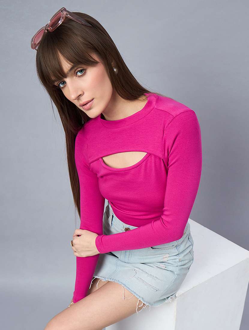 women solid long sleeve cut out crop top - 21958391 - Very Small Image - 1
