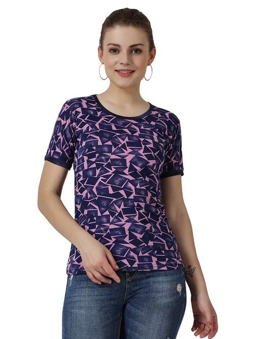 Affair Pink Navy Round Neck Slim Print Top For Girls & Women by Soft ,Light Weight & Smooth Cotton Blend Brush Cotton Material