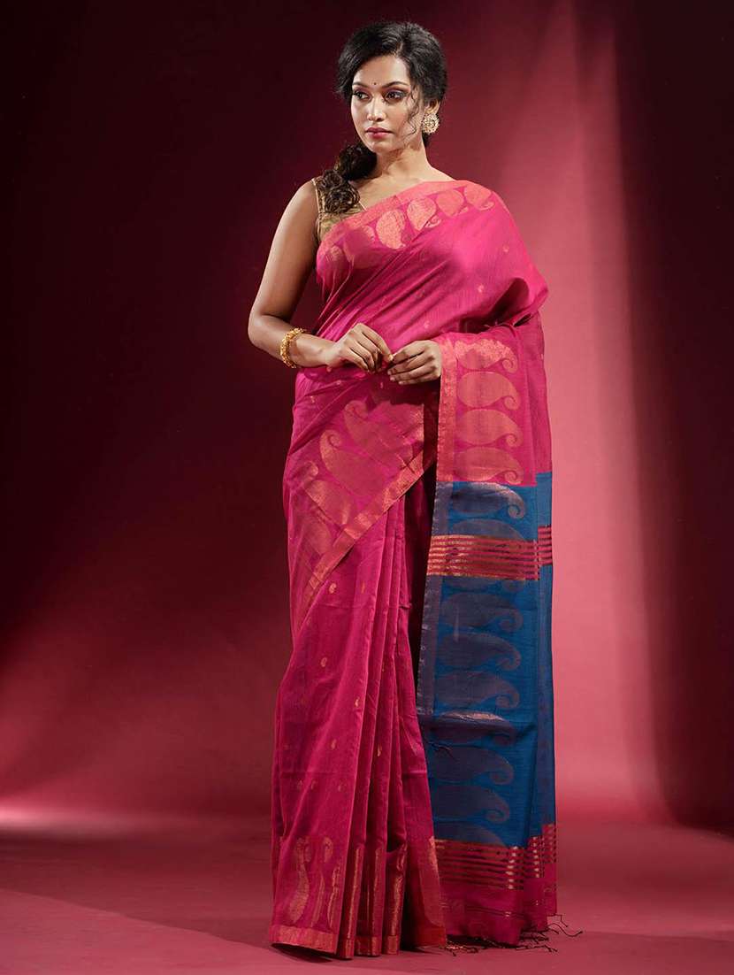 Youthfully charming is what you will look in this taffy pink blended cotton handwoven saree. It has small paisley motifs woven all over with zari and the borders have bold paisley patterns. The contrasting cerulean blue pallu along with stripes to complete the look.