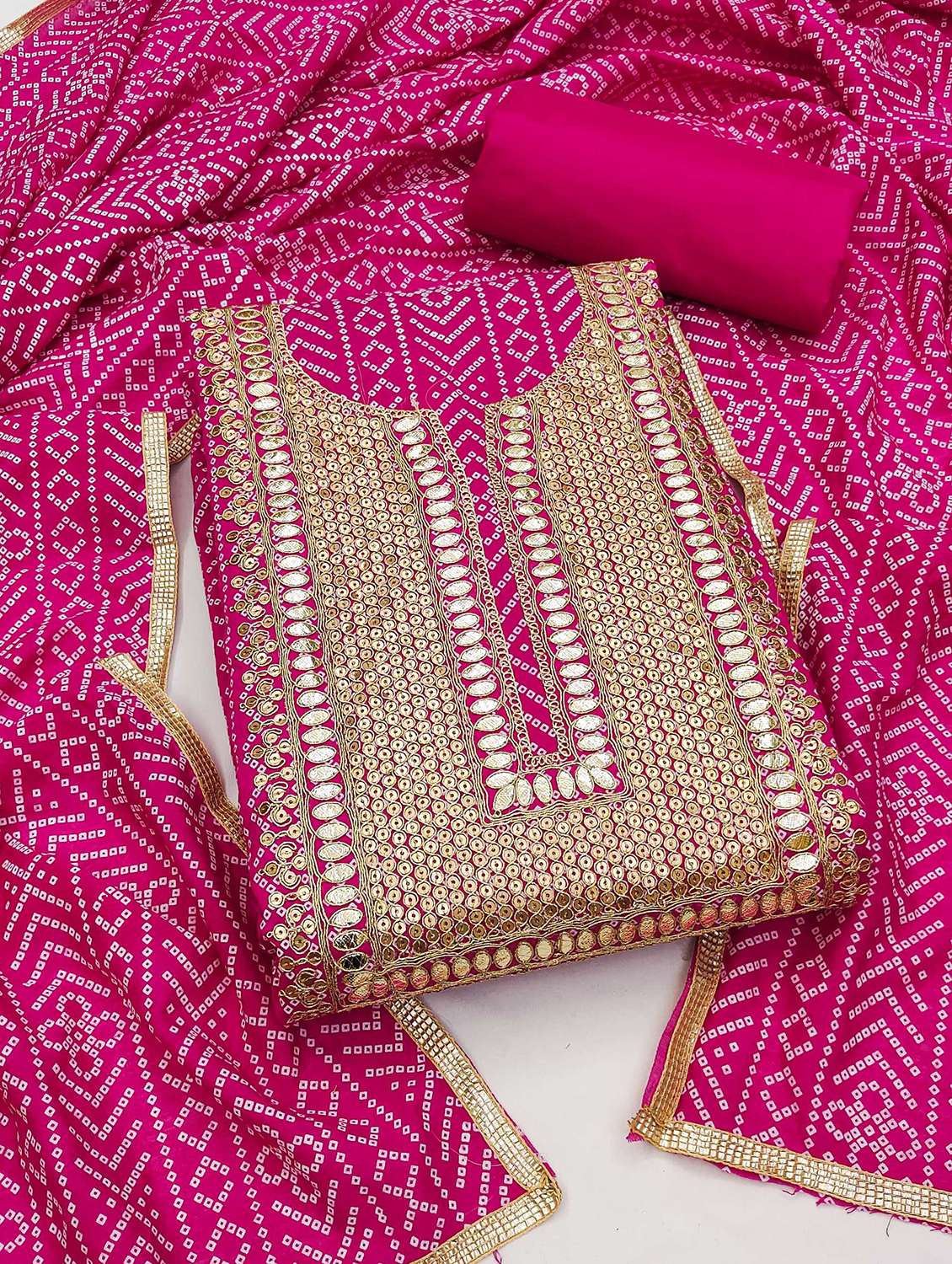 - » women bandhani printed embroidered unstitched suit set