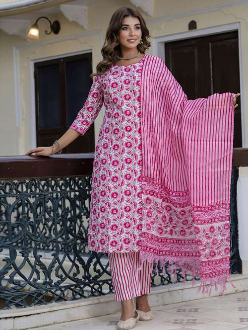 • Find gorgeous sets of ethnic wears in trending designs in pink colors suitable for casual wear of occasions.