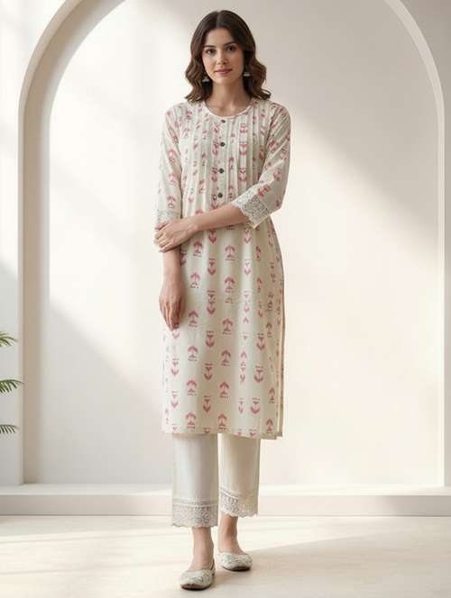 - Find gorgeous sets of ethnic wears in trending designs in off white colors suitable for casual wear of occasions.