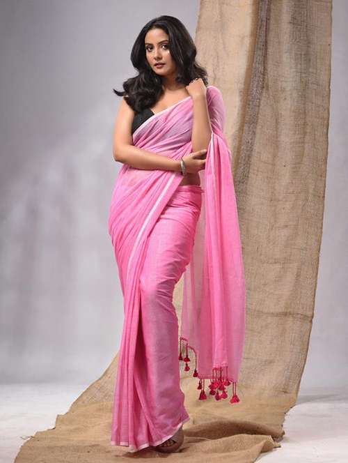 Look classy and posh in this light pink cotton handloom saree. It has plain body with simplicity. The pallu is highlighted with pompom to complete the look.