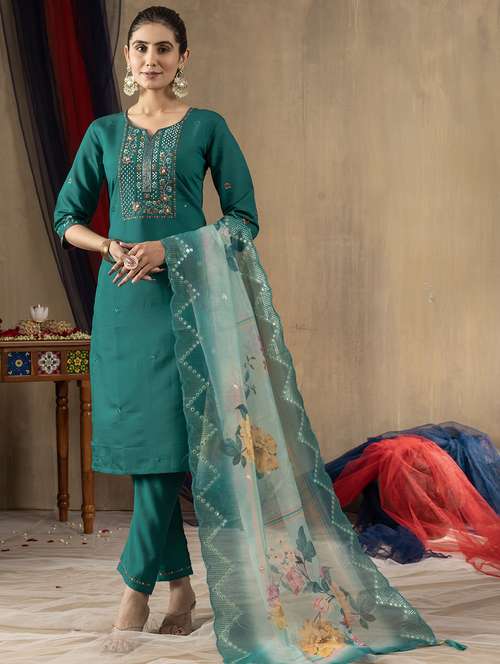 - Find gorgeous sets of ethnic wears in trending designs in teal colors suitable for festive wear of occasions.