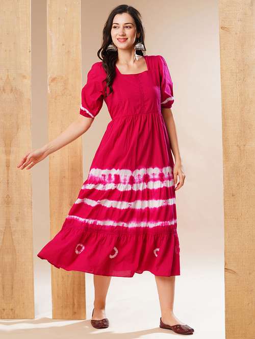 globus women pink square neck puff sleeves tie-dye print tiered fit & flare midi dress