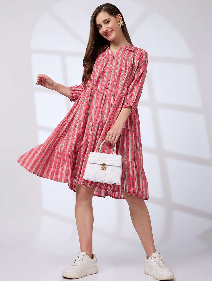 - » globus women pink shirt collar regular sleeves floral print a-line tiered work wear dress