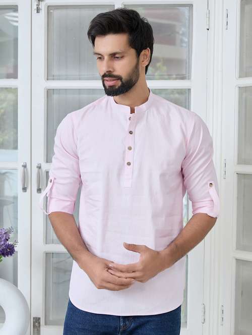 Cotton Short Kurta features a mandarin collar, long sleeves, a curved hem, and side slits for added comfort and style.