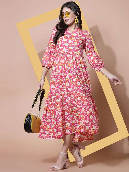 - Dress up in a soothing pattern and don this dress made of cotton material.