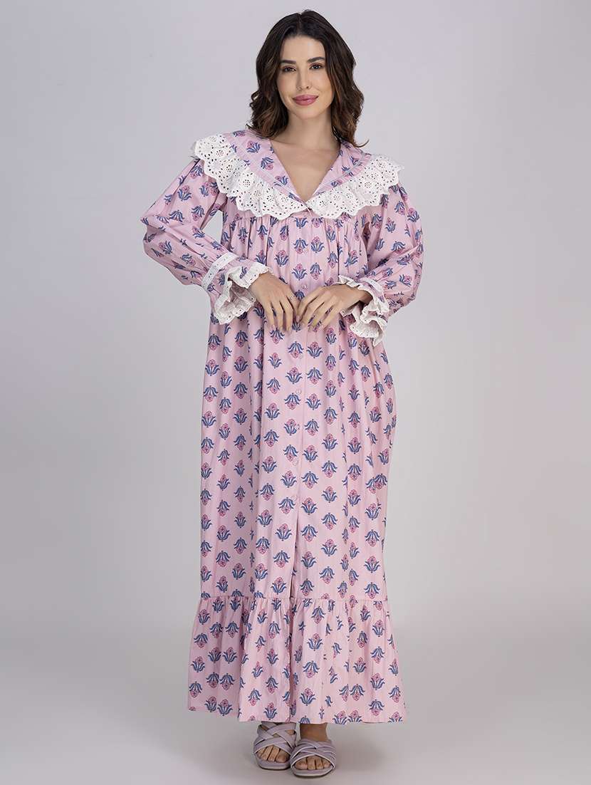 women printed lace detailed long sleeves nighty