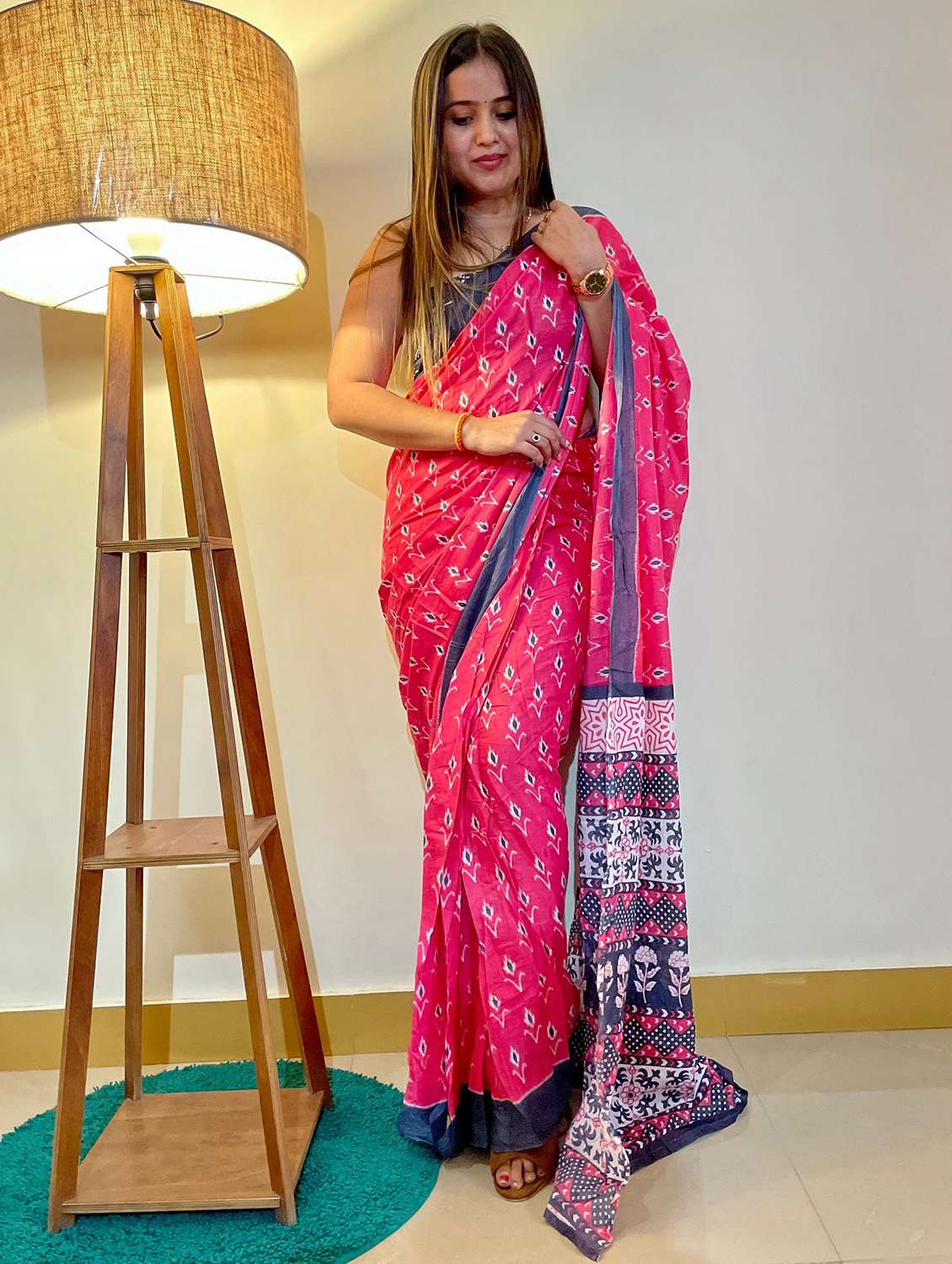Leave behind a trail by wearing this pink saree from Mull Sutra. Tailored to sartorial perfection from premium quality fabric, it assures a soft and soothing touch against the skin. The printed pattern makes it a captivating choice. It also comes with an unstitched blouse piece. It has a length of 5.5 meters and width of 1.11 meters.