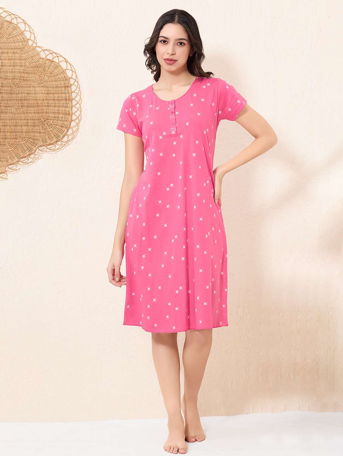 Quira Women's Hosiery Printed Nighty - Half Sleeves, Round Neck, Knee Length.