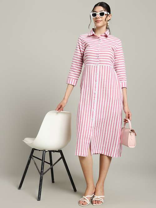 Pink Striped Shirt Dress with a shirt collar and three-quarter cuff sleeves. with a belted waist, midi-length dress a straight hem. breathable cotton fabric, it has a button-down closure.