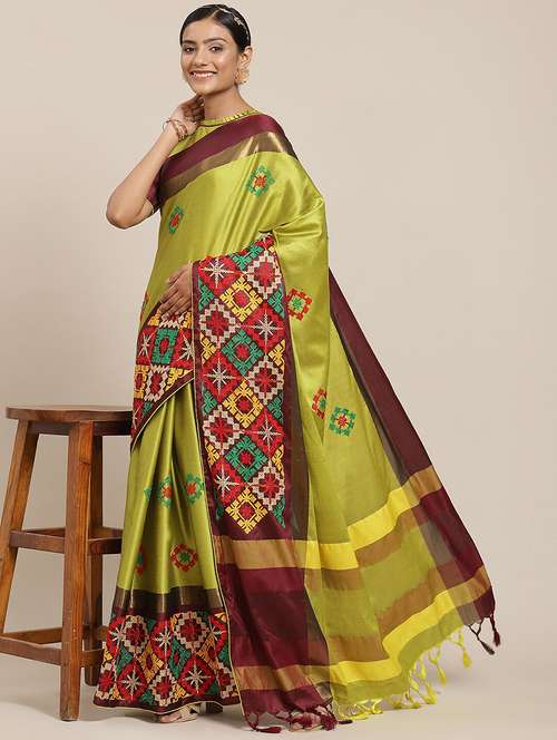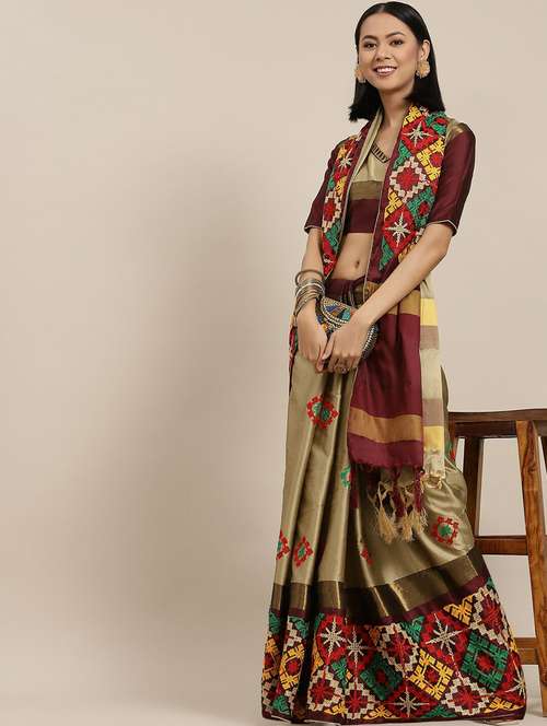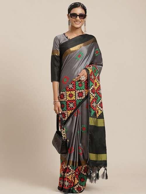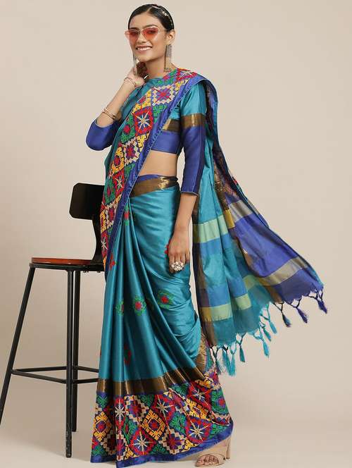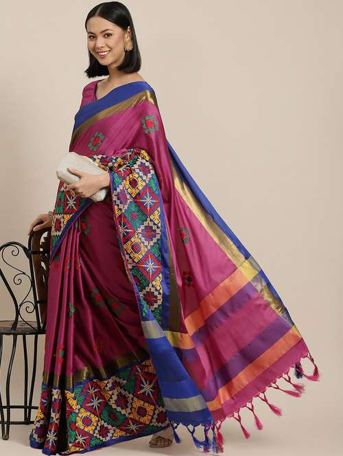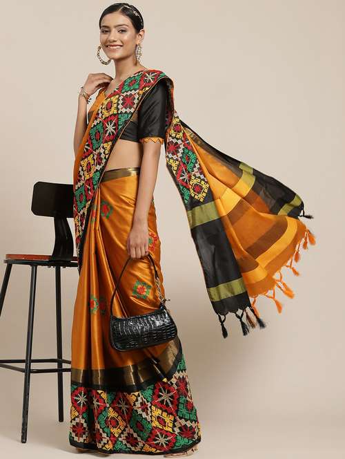 Riva Enterprise women's cotton silk kutchi embroidery contrast border saree with blouse