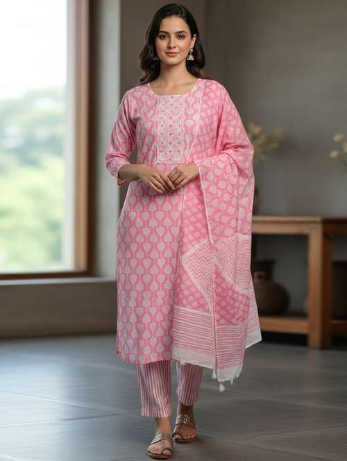 - Find gorgeous sets of ethnic wears in trending designs in pink colors suitable for casual wear of occasions.