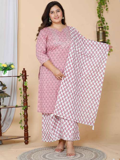pink suit setwomen plus size floral three quarter sleeve kurta palazzo with dupatta set