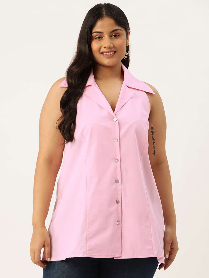 theRebelinme Plus Size Women's Pink Solid Color Button Closure Shirt Collar Top, has a shirt collar, front button closure, sleevesless and straight hem.
