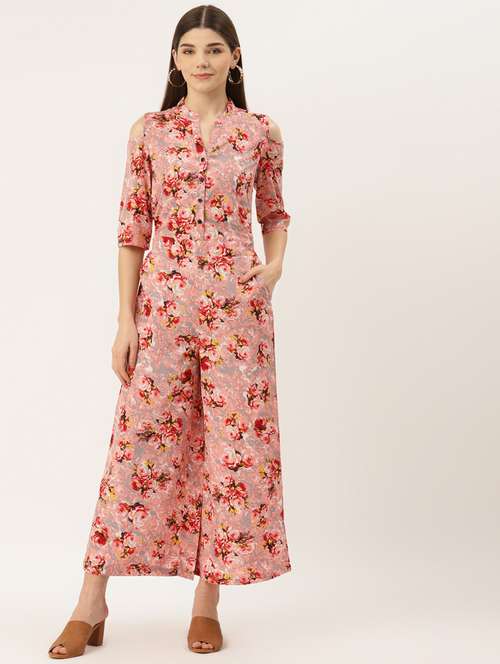 - » pink polyester floral print full length jumpsuit