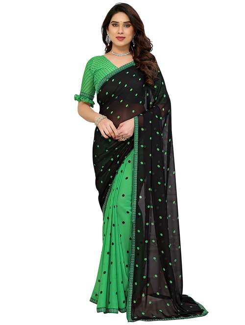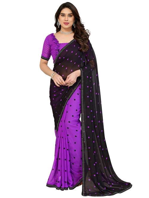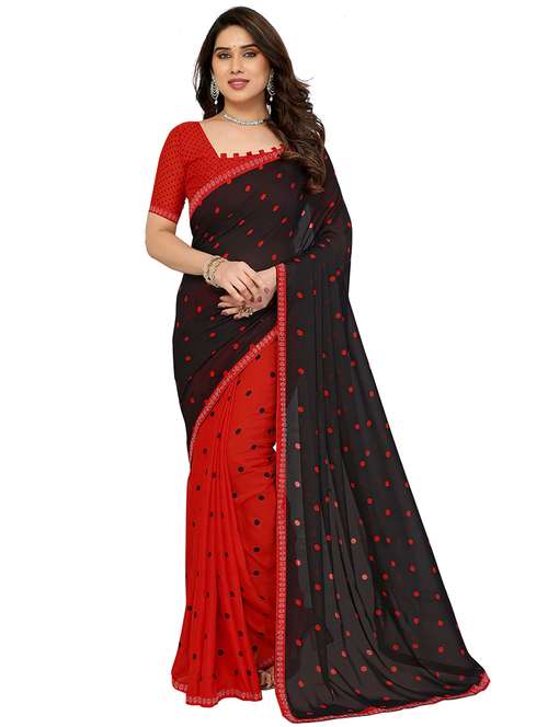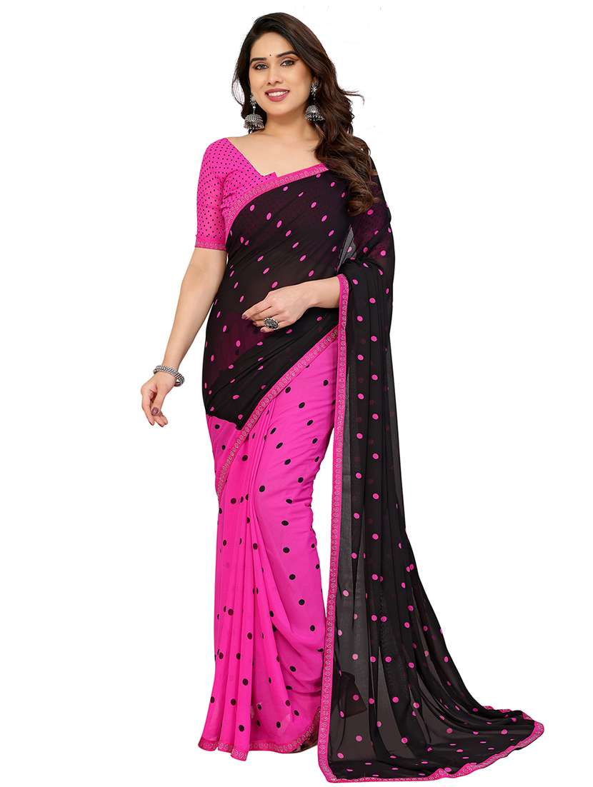 The Embellished Polka Print Georgette Saree with Diamond Lace in Pink and Black is Crafted from lightweight georgette fabric, this saree offers a comfortable fit and a flowing drape, perfect for any occasion. The playful polka print in pink and black adds a retro yet stylish vibe, while the intricate diamond lace border lends a touch of sophistication. Ideal for festive gatherings, casual outings, or semi-formal events, this saree pairs beautifully with a complementing blouse and statement accessories for a chic and graceful ensemble.