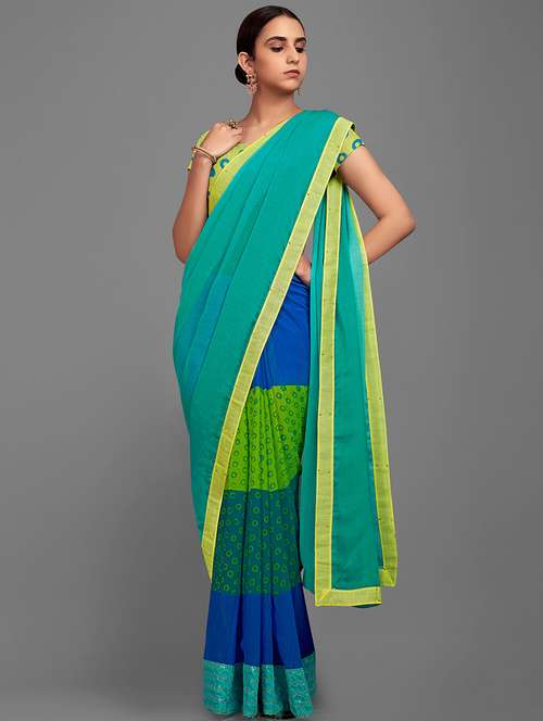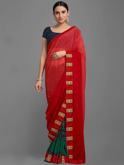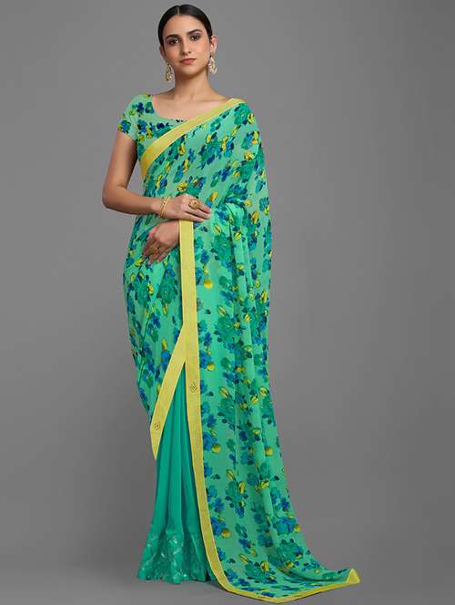 Splash a sensation of innocence and beauty with this pink green colored half-half saree. This magnetize saree prettified with beautiful print work which makes it more elegant look. This saree is made of georgette chiffon blend fabric accompanied with unstitched matching blouse piece which can be designed as per your style & requirement. This saree is perfect for parties, festivals and occasions, where you want to be center of attraction. Pair it with stylish accessories to make your look more beautiful. It's a must have saree in your ethnic collection. Buy this saree now as it's a unique piece with attractive color and beautiful designs which is rare to find.