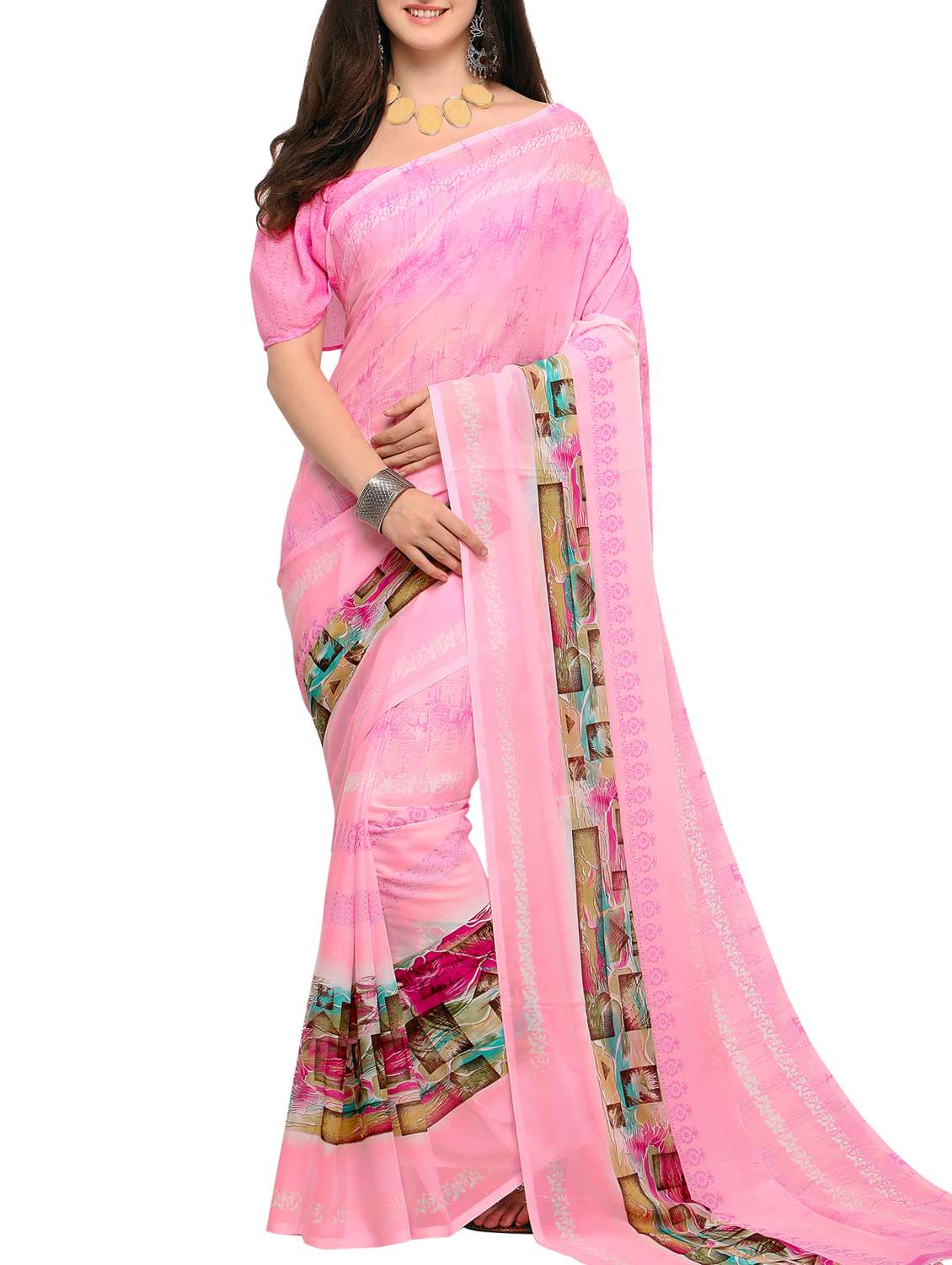 Light weight georgette saree with geometric prints. Blouse attached is also made of georgette; Material Measurements: 5.2 m long & 112 cm wide saree. Blouse length - 80 cm; This casual wear saree is soft, comfortable and drapes perfectly on your body