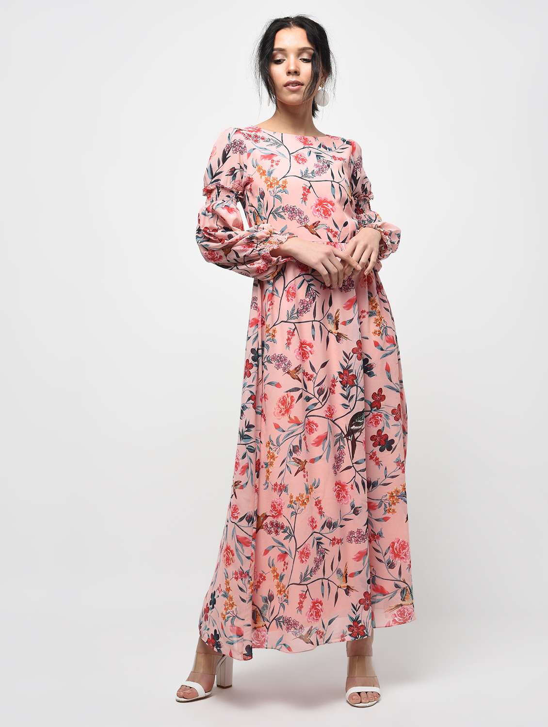 smocking detail floral maxi dress
