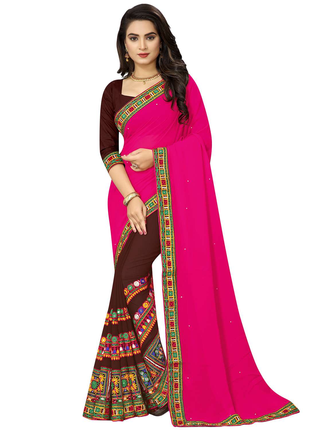 Saree Fabric : Georgette , Blouse Fabric : Georgette Features: Designer Embroidery Work Embellishment Type : Designer Embroidery Georgette Half & Half Saree Pattern : Flower Pattern Embroidery Work Saree Transparency : Good Fabric Saree Dimension : Saree Length - 5.5 MTR , Blouse Length - 0.8 MTR Pack of : 1 Saree : 1 Blouse This Embroidered Saree Concept Has been Made By Serona Fabrics Designer For Wedding Engagement Or Any Occasion Which Will Add Glamour To Your Beauty