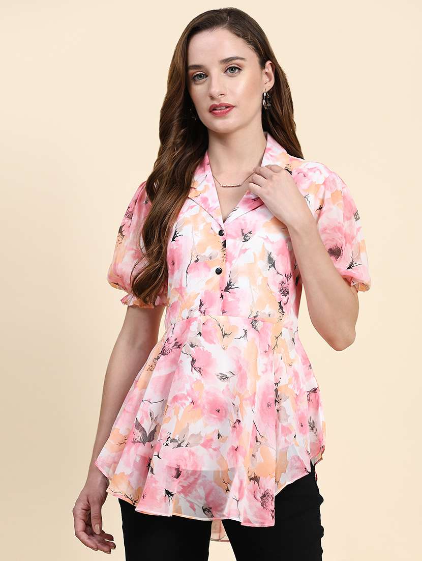 women printed puff sleeves asymmetric top