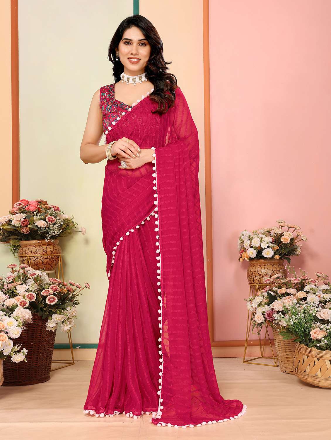 The Trendy Store presents a stunning Women's Georgette Patta/Stripe Pom-Pom Lace Border Saree, designed to elevate your fashion statement. This exquisite saree features a delicate pink hue, complemented by intricate lace borders and playful pom-pom detailing, making it a perfect choice for festive occasions or casual gatherings. The accompanying unstitched blouse piece allows for customization, ensuring a perfect fit and style that suits your personal taste. Embrace elegance and charm with this versatile saree that effortlessly blends tradition with contemporary flair.