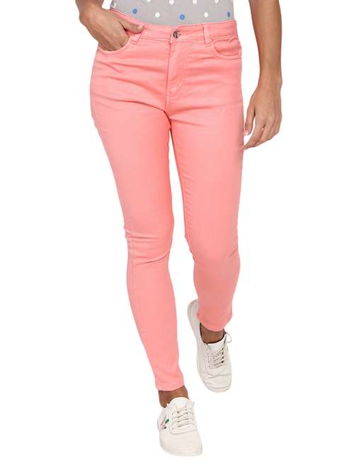 - » women solid pink skinny fit jeans