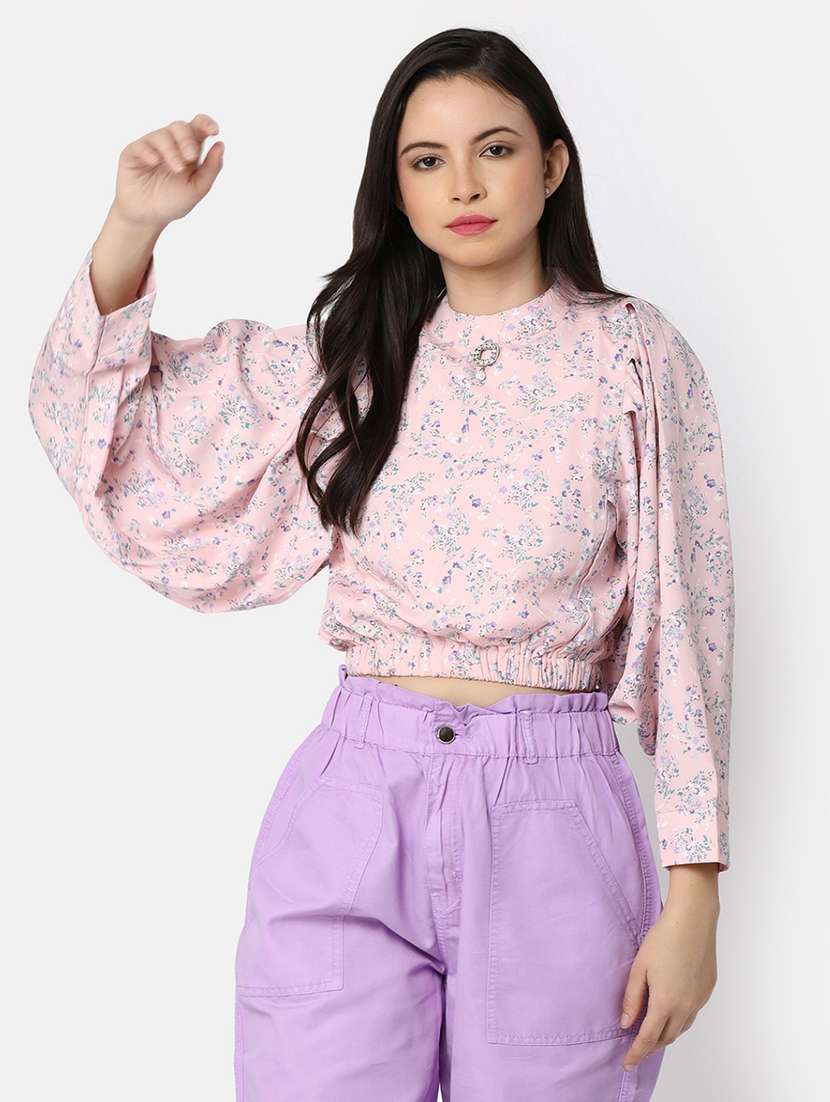 Confer a contemporary edge to your attire with this Printed Pink Cropped Top for Women. Tailored from Georgette this Top ensure that you feel relaxed and comfortable while it provides you the freedom of movement and a flattering silhouette. It looks appealing with a Spread Collar and Long Sleeves. Featuring All Over Printed pattern and Flared Sleeves, this Fitted Top is available in a range of sizes, you can choose the one that best suits your style and body type. Team it up with a pair of Denims and sandals to look effortlessly stylish. Model in this image is 5'8\" in height with bust size 32 inches and waist size 26 inches. She is wearing size M.